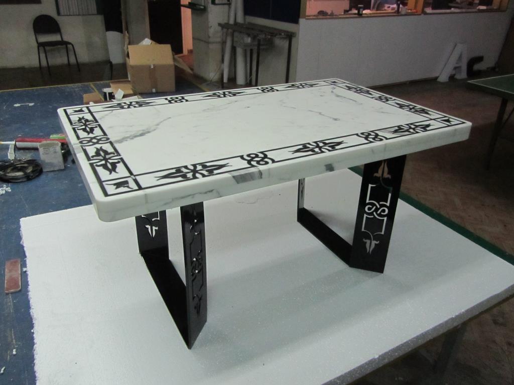 Описание: Столешница из мрамора, рисунок выполнен по технологии инкрустации (резка, склейка, шлифовка и полировка). Опора - сталь 5 мм, гидроабразивная резка, порошковая покраска.