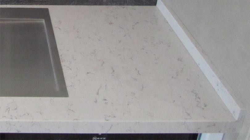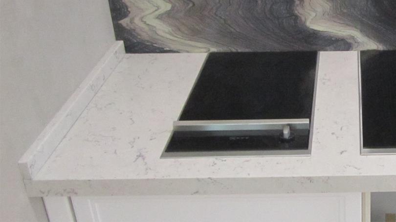 Изготовление и монтаж кухонной столешницы, составная (со стыком). Материал – агломират кварца 20 мм. Подклейка «фальш-панели». Гидроабразивная резка, обработка кромки, подклейка фальш-панелей, снятие и полировка фаски, установка мойки, варочной поверхности.