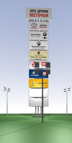Изготовление и монтаж. Фундамент, монтаж металлоконструкций Металлические опоры, светильники, щит наружного освещения, кабель силовой, реле времени. Рекламные щиты 5500 х 2500 мм х 250 мм - на металлический каркас крепятся плоские металлические подрамники с натяжкой банерной ткани, полноцветная печать. Доставка стелы и рекламного наполнения на место монтажа.