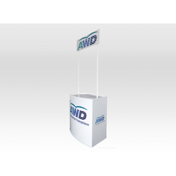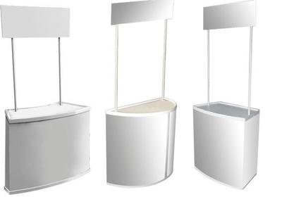 Столешница - ламинированная ДСП 16 мм. Рекламная плоскость - пластик ПВХ 3 мм с аппликацией пленкой с полноцветной печатью 720 dpi.