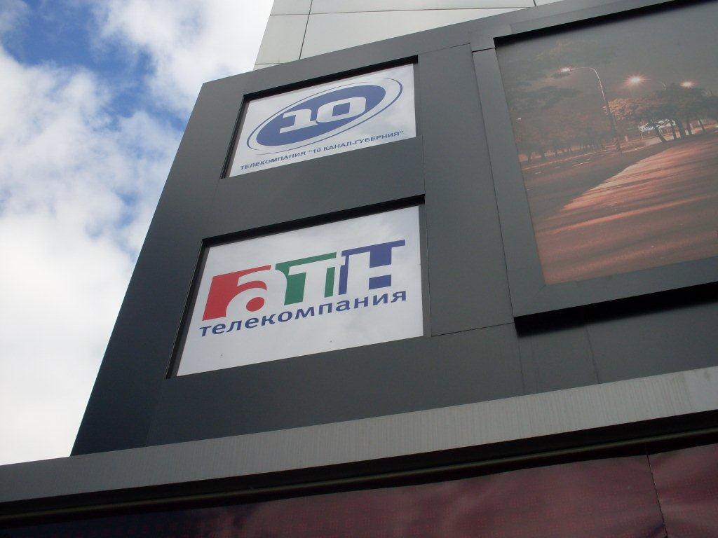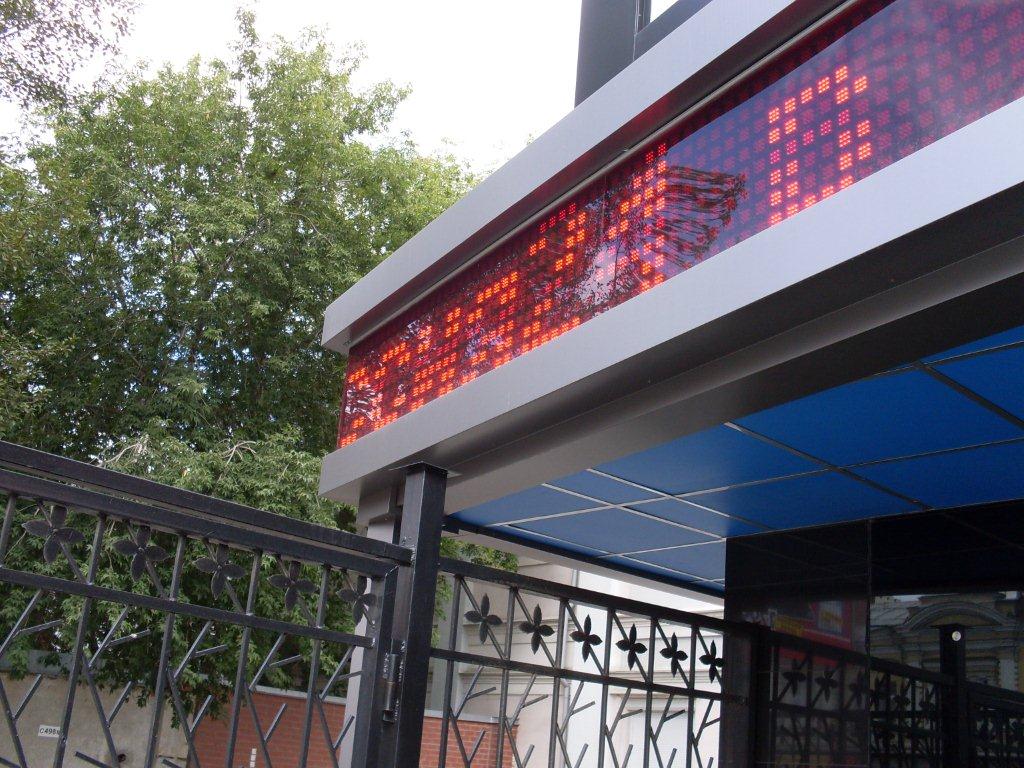 Корпус «Рекламоносителя» 7000х4000х1000 мм - металлический каркас, обшивка композитным материалом (черный). Световой блок «Рекламонасителя» 4500х2900 мм (1 шт) - прорезка в композите, лицевая плоскость банерная ткань, изображение полноцветная печать, внутренняя подсветка люминесцентные лампы. Логотипы компаний световые 1400х1000 мм (2 шт) - прорезка, вставка акрила молочного 3 мм, изображение аппликация пленкой ПВХ, внутренняя подсветка люминесцентные лампы. Логотипы компаний на фасаде АТН и 10-й, 600х600 мм (2 шт) - основа композит, изображение аппликации пленкой ПВХ. Угловое электронное табло «Бегущая строка» (высота символа 400 мм) - цвет индикации красный, пиксель состоит из девяти светодиодов, общие габаритные размеры: левая часть 7225 мм, правая 4025 мм; интерфейс связи: проводной с переходником на USB.Корпус «бегущей строки» 7225х600 мм (1 шт), 4025х600 мм (1 шт) - металлический каркас, верхняя и нижняя полоса 150 мм (высотой) - обшивка композитным материалом (серебро).