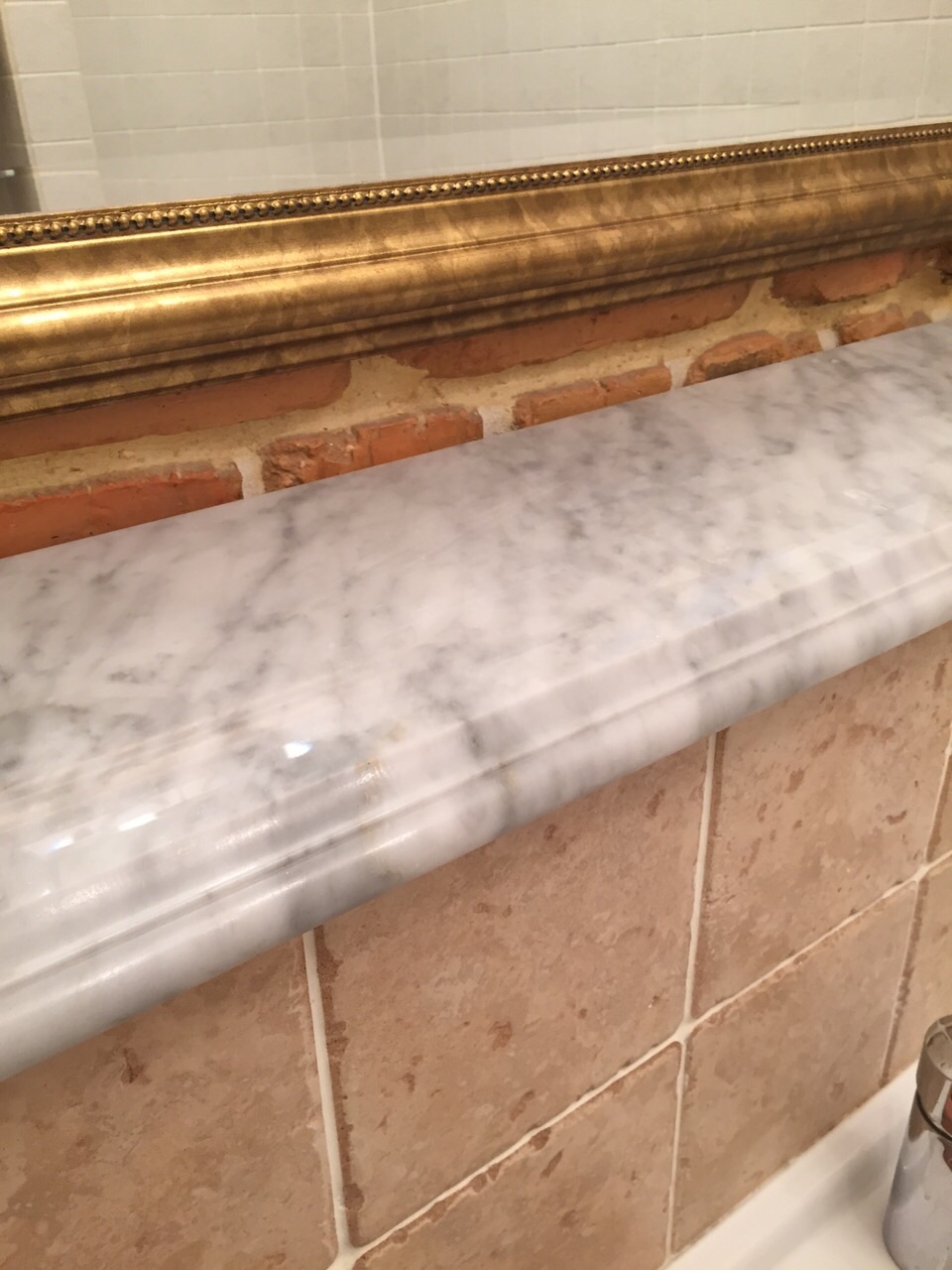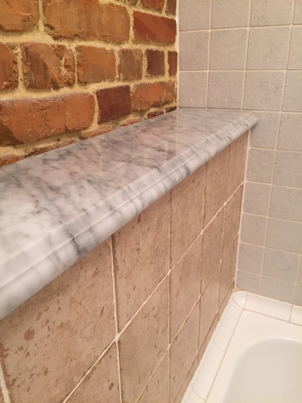 Изготовление полочки из натурального мрамора, механическая обработка кромки на пятиосном станке Ravelly, снятие и полировка фигурной фаски. Проведен полный цикл производственных работ - выезда на замеры, проектировка, закуп материала, изготовление, монтаж.