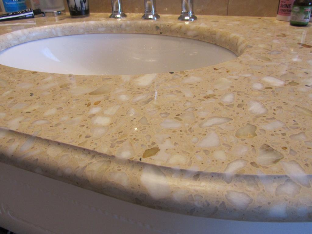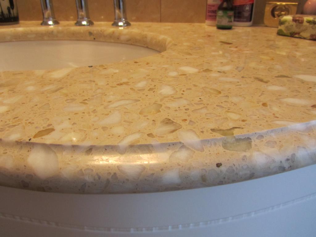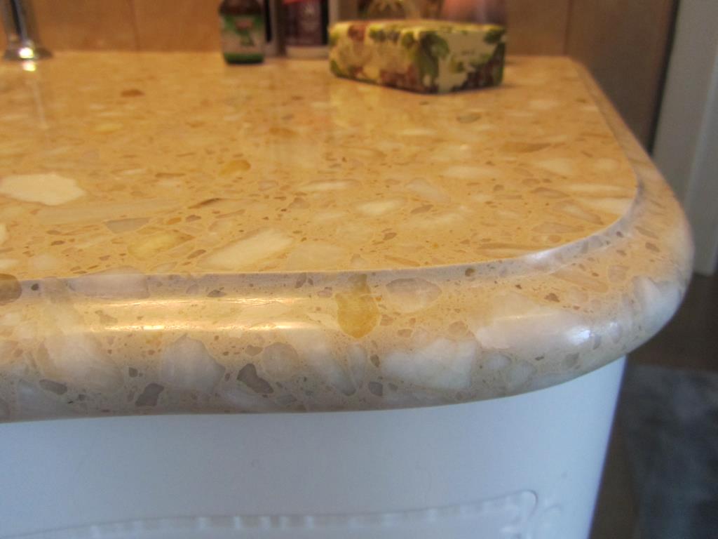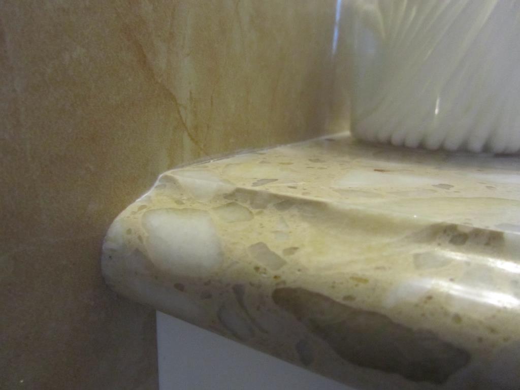 Индивидуальный заказ, уникальная форма столешницы и сложная фигурная фаска. Материал - агломират мрамора 30 мм толщиной. Были проведены замеры, включая снятие шаблона криволинейной формы базы, изготовление столешницы, снятие и полировка фигурной фаски, установка столешницы, монтаж мойки с подклейкой снизу.