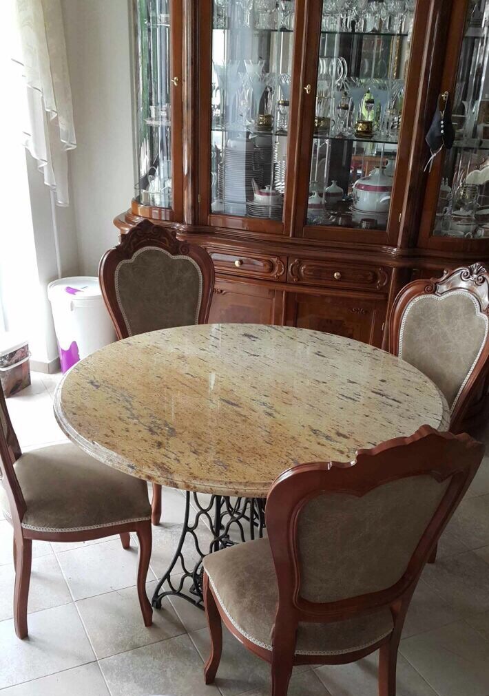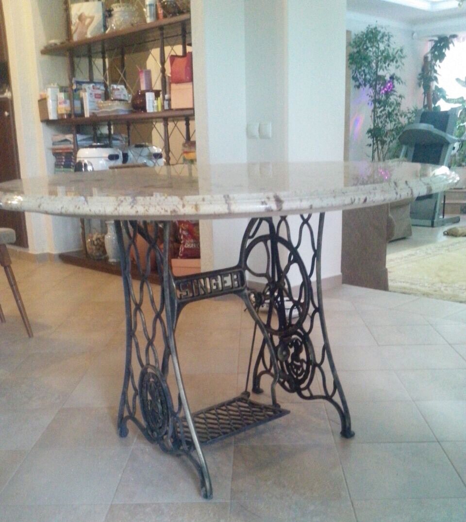 Изготовление стола полностью под ключ. Материал для столешницы - натуральный мрамор в сэбах, толщиной 30 мм. Снятие и полировка фигурной фаски на собственном станке Ravelly. Опора столешницы - от старой швейной машинки Singer, найдена и привезена специально для этого заказа. Смотрится очень эффектно.