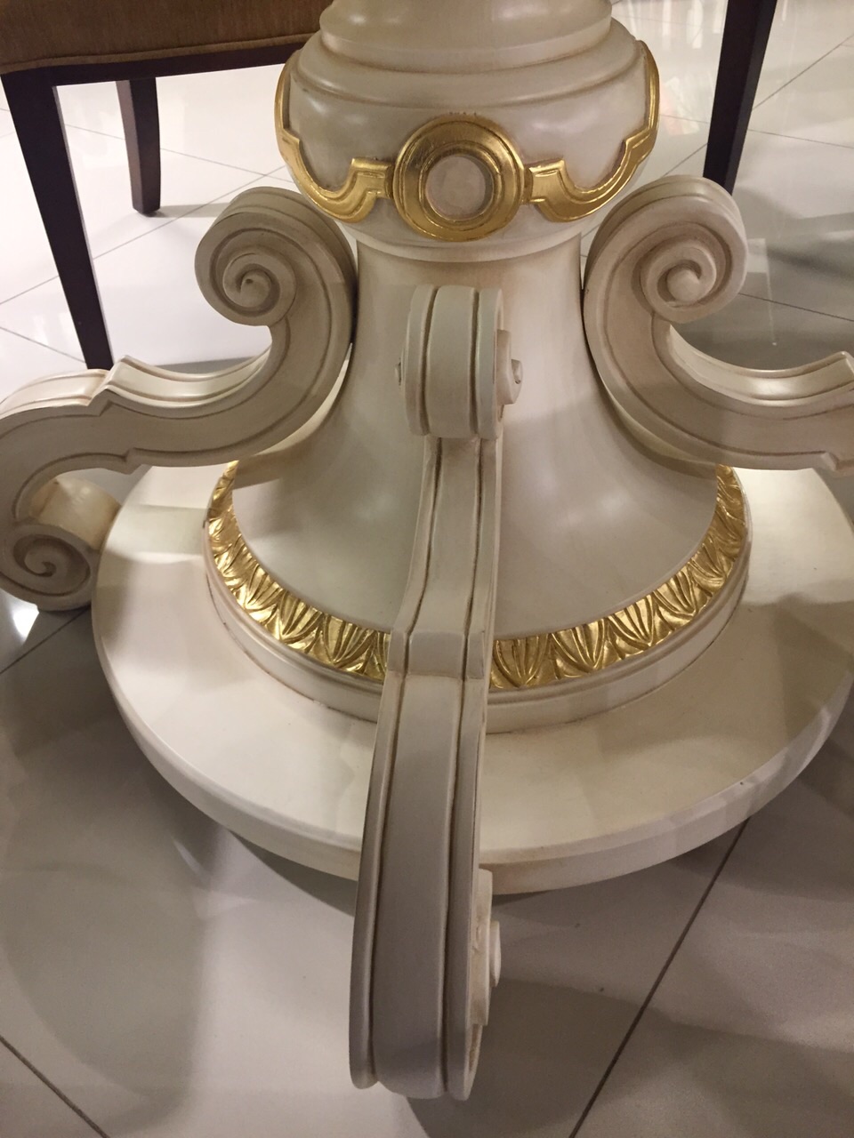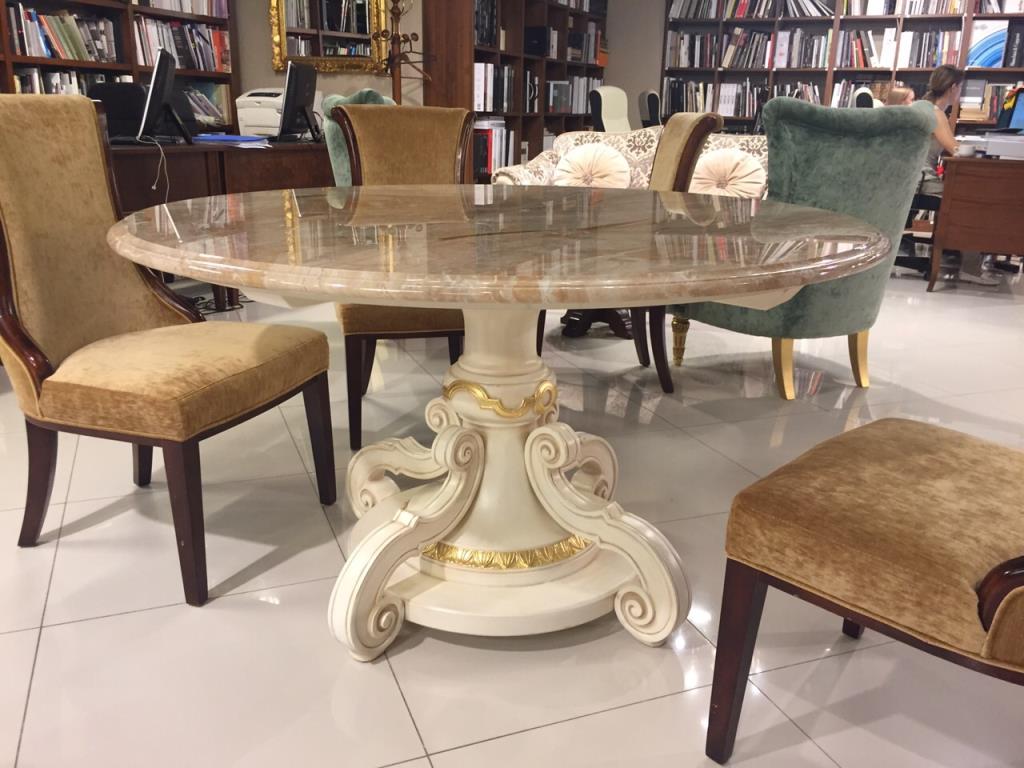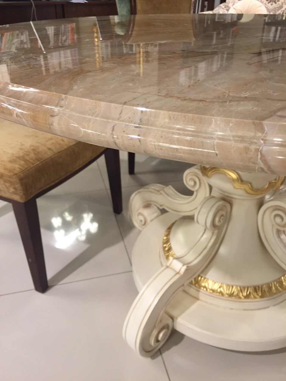 Изготовление круглого стола. Опора - дерево, покраска, покрытие патиной. Столешница диаметром 1450 мм, из натурального мрамора, снятие фигурной фаски и полировка на станке Ravelly.