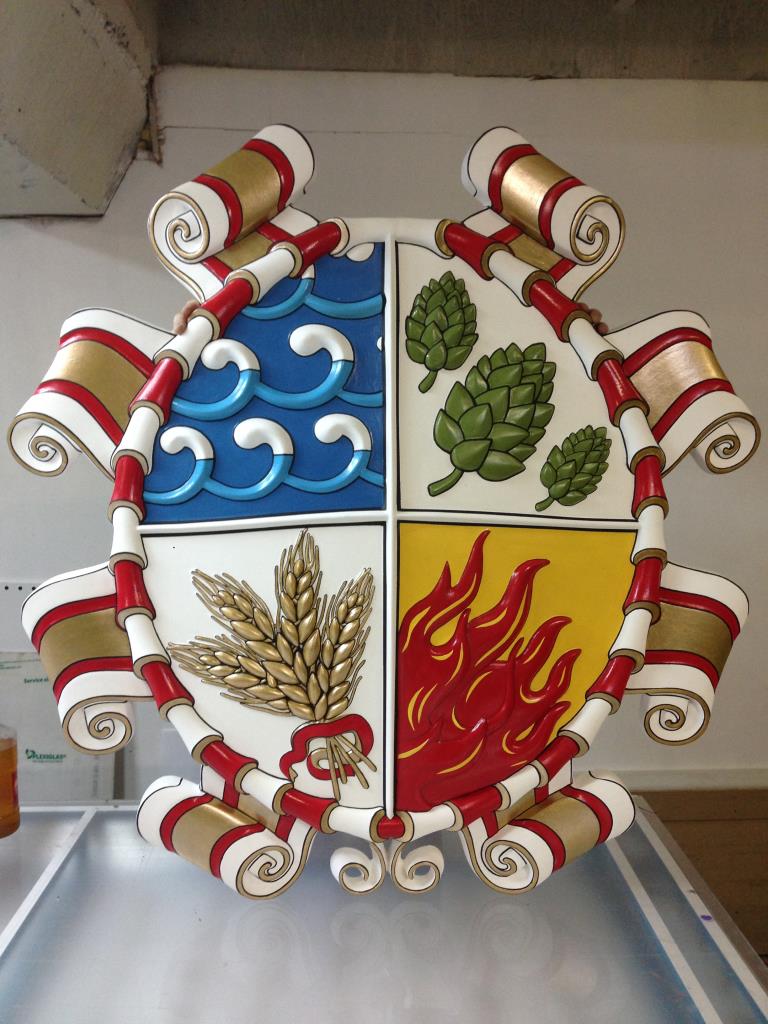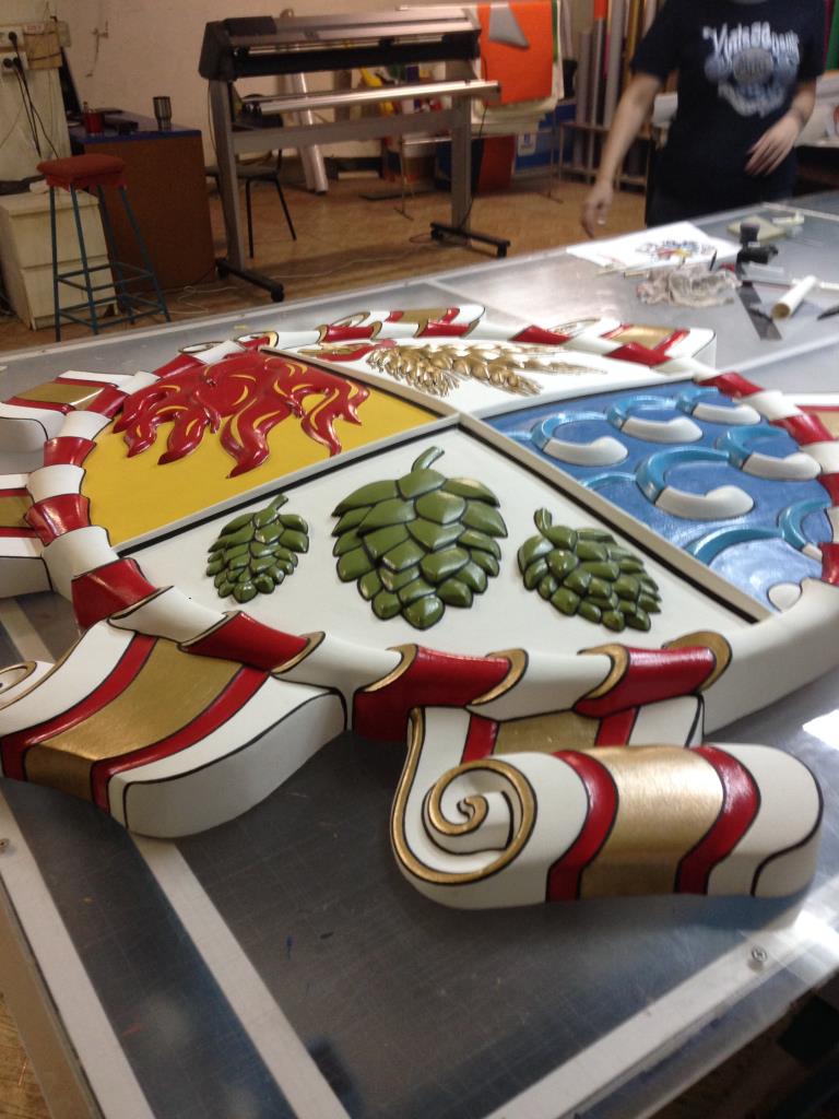 Изготовление и монтаж объемных букв и герба. Технология изготовления герба: модельный пластик, 3D резка, нанесение акриловых красок. С обратной стороны – выборка фона, установка светодиодной подсветки (свечение контражур, цвет теплый белый). Объемные буквы из нержавеющей стали (цвет золото), с упор-загибами под заднюю стенку, толщина буквы 60 мм. Задняя стенка прозрачный акрил 4 мм с транслюсцентной пленкой Oracal 8500 (цвет белый). Внутренняя подсветка – контражур, светодиоды (цвет теплый белый). Крепеж на относе от основы на 50 мм.