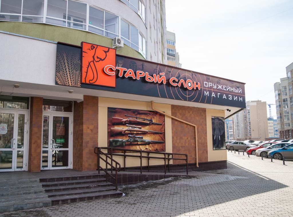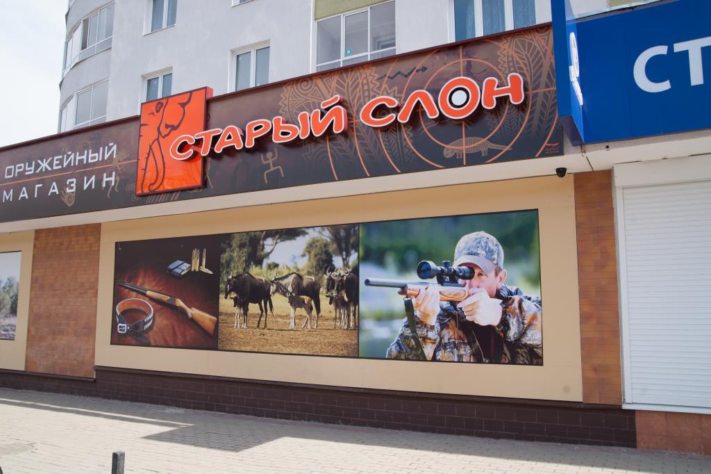 Основа - металлический каркас, обшивка композитом, толщина короба 60 мм. Фоновое изображение – аппликация пленкой ПВХ с полноцветной печатью. Текст «оружейный магазин» 3082х670 мм (2 шт.) – прорезка в композите, вставка молочного акрила 3 мм, внутренняя подсветка светодиоды (белое холодное свечение). Объемные световые элементы. «Логотип» 1470х1357 мм (2 шт.) - короб с внутренней подсветкой, лицевая плоскость специальный акрил Plexiglas TruLED с аппликацией пленкой ПВХ, боковые стенки алюминий с аппликацией пленкой ПВХ. Внутренняя подсветка люминесцентные лампы. Буквы «Старый слон» h=353 мм (2 комплекта) – лицевая плоскость молочный акрил с аппликацией транслюсцентнй пленкой ПВХ, боковая и задняя стенка пластик ПВХ. Внутренняя подсветка светодиоды (белое холодное свечение). Крепление на относе от основы на 50 мм.