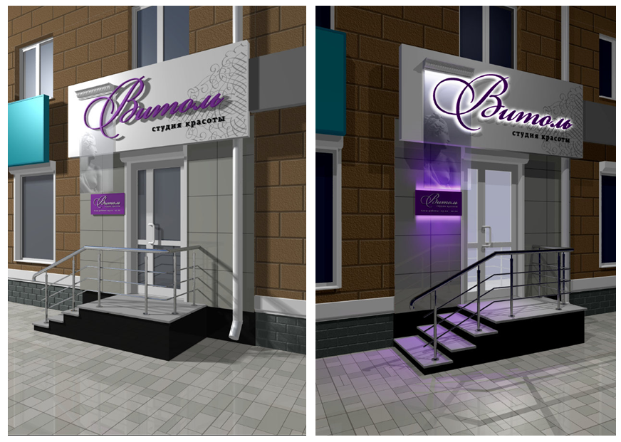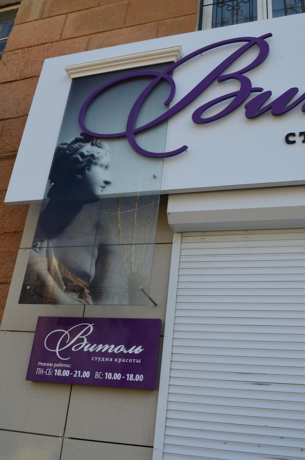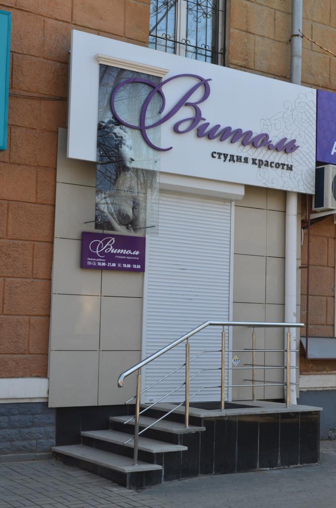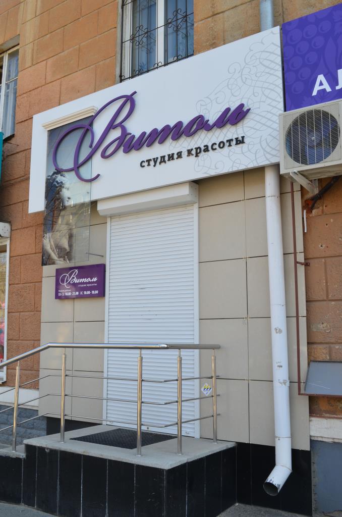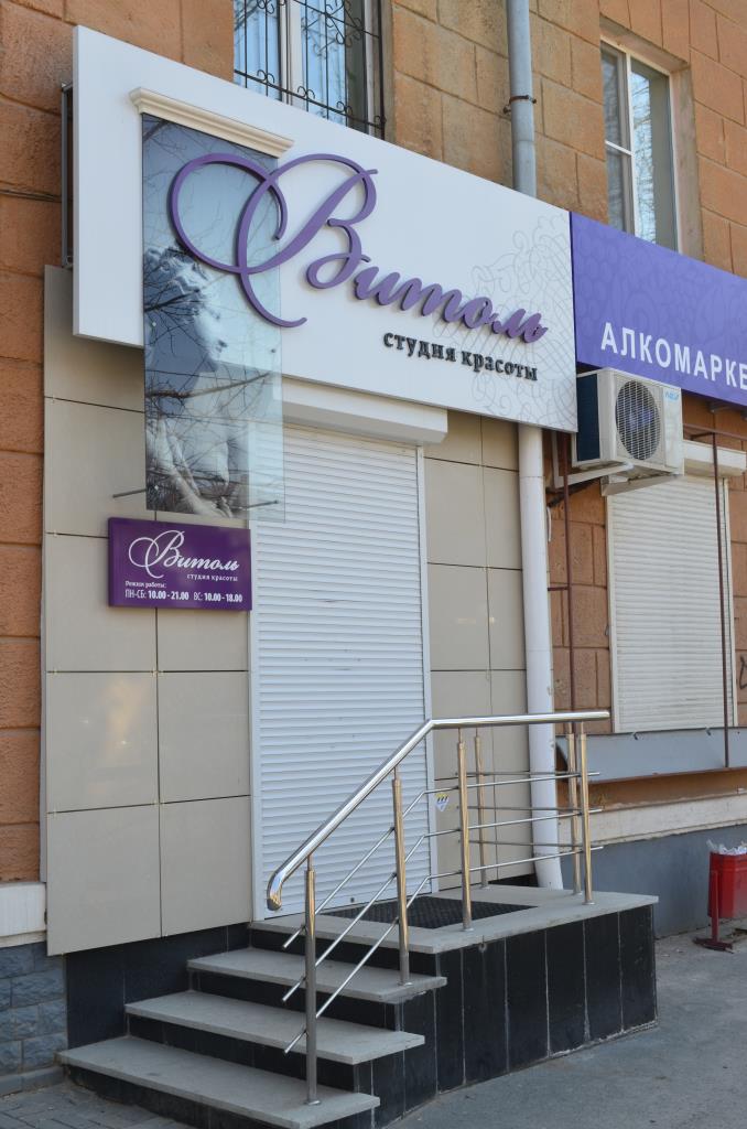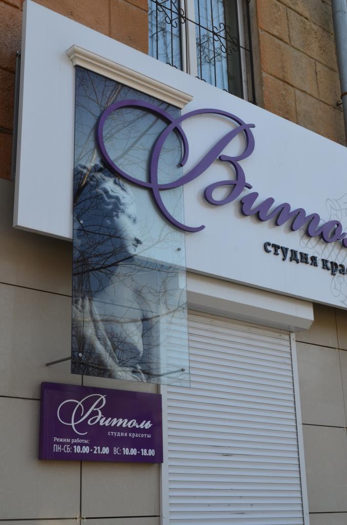 Изготовление вывески «Витоль» 3615 х 1400 мм. Основа – металлический каркас, обшивка композитом с аппликацией пленкой. Надпись «Витоль» 2800 х 971 мм – объемные буквы на дистанционных держателях с контражурной подсветкой светодиодной нитью. Надпись «студия красоты» 93 х 1312 мм: объемные несветовые буквы. Основа – ПВХ 10, лицевая стороны – черный акрил. Карниз 820 х 150 мм – лепнина из полиуретана. Изготовление вертикального прозрачного короба с изображением 1800 х 820 – триплекс с закаткой изображения изнутри. Подсветка – светодиоды. Изготовление режима работы 820 х 400мм: Основа – композит с аппликацией пленкой со светодиодной подсветкой (сверху и снизу). Надпись «Витоль» – накладные буквы – акрил молочный 3 мм.